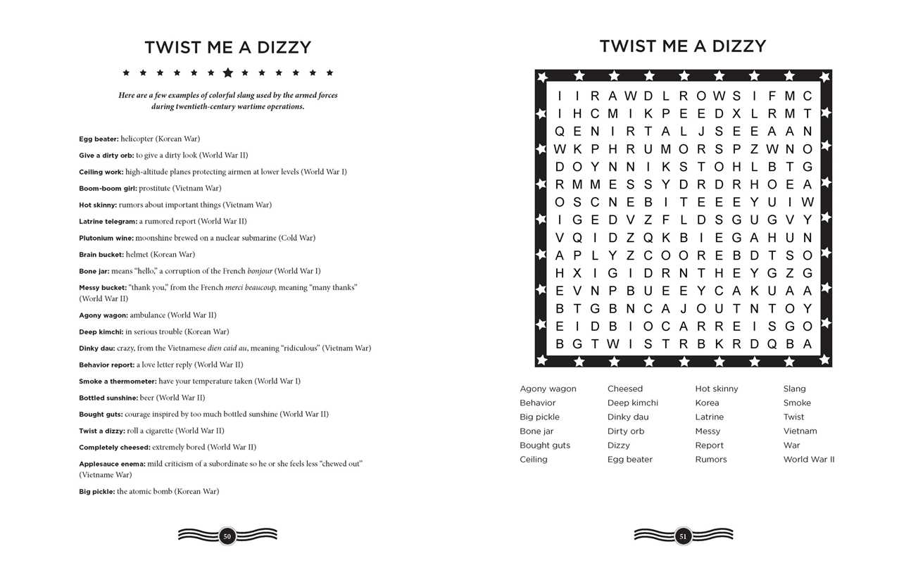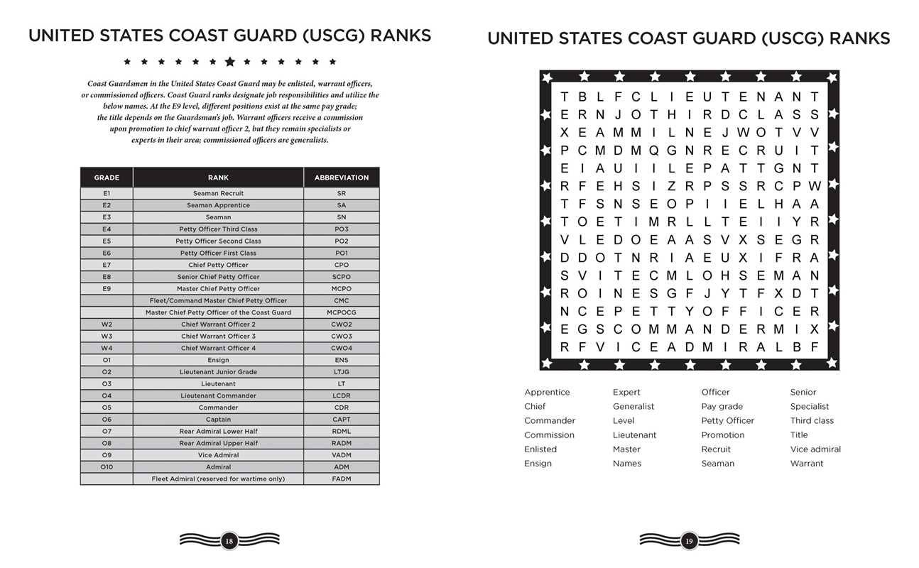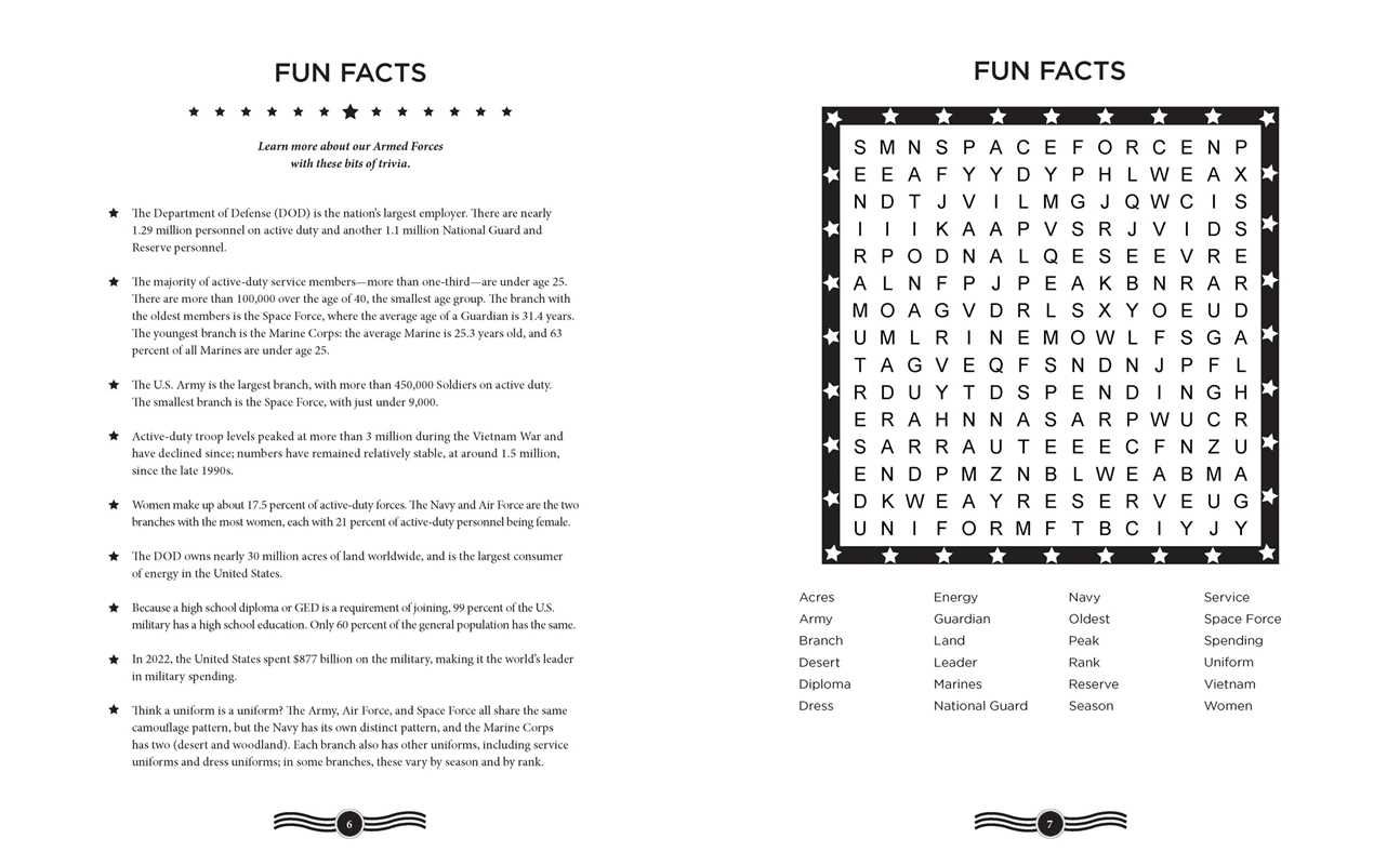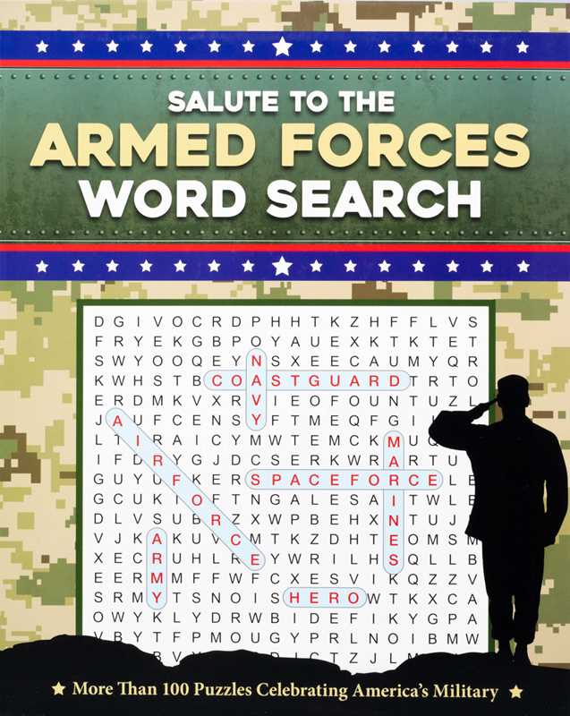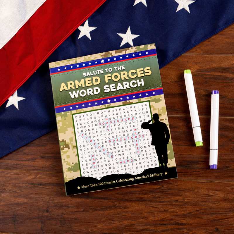 [Printers Row] Explore the rich history and traditions of the United States military as you complete more than large-print 100 themed word search puzzles. Along with more than 100 themed, large-print word search puzzles, Salute to the Armed Forces Word Search includes informative articles, fun facts, and trivia about the United States military, past and present. All the active branches are represented—Army, Navy, Air Force, Marine Corps, Coast Guard, and the newly created Space Force—in this book that will appeal to military veterans and history enthusiasts alike. Whether you’re at home or on the go, word searches are a great way to enjoy a little time for yourself—while learning a bit more about the proud traditions of the United States Armed Forces.