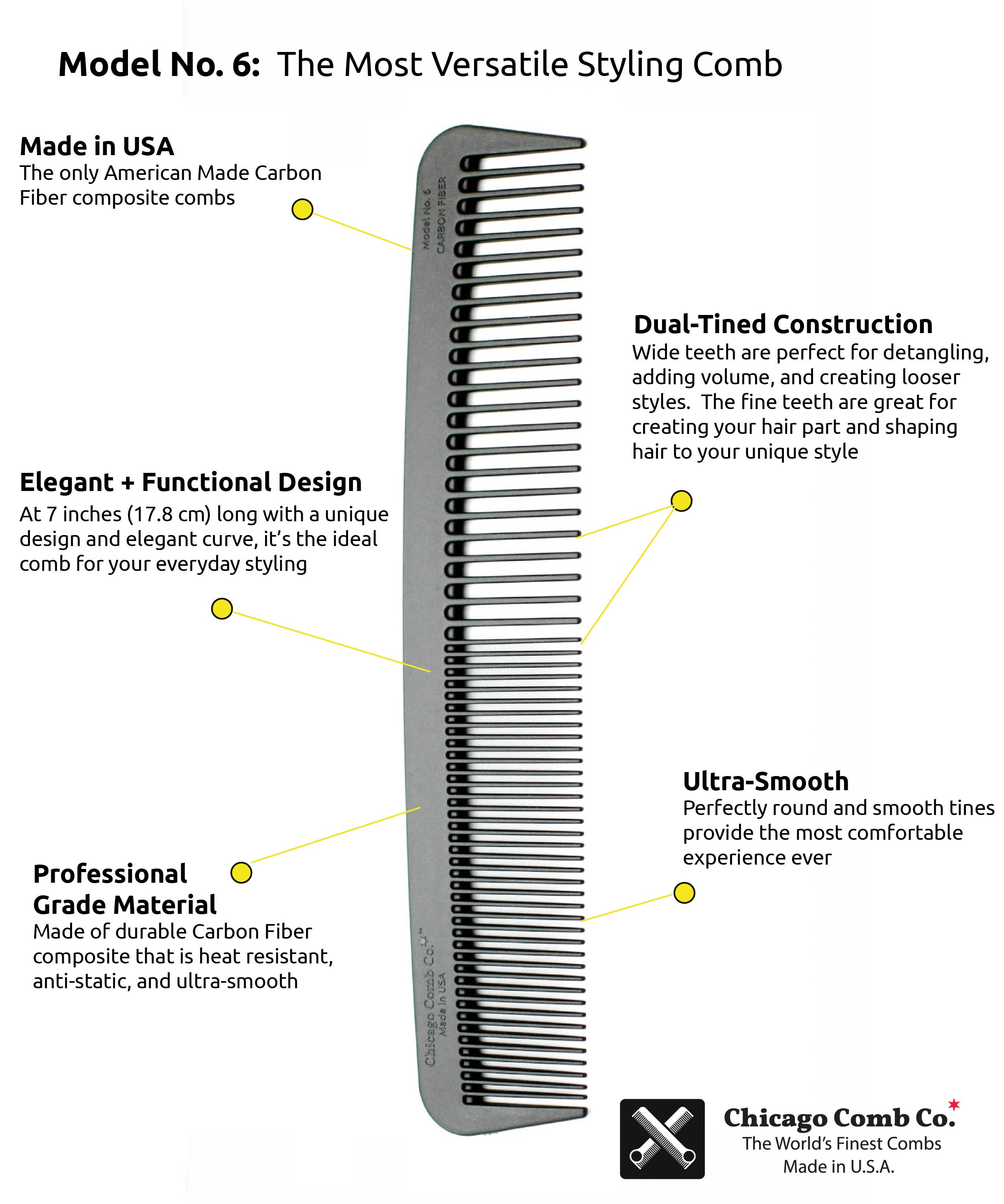The new Model 6 Carbon Fiber is an all-new design with an elegantly curved shape and both fine and wide teeth. At 7" (17.8 cm) long and 1.4" (3.5 cm) high, it's the perfect comb for the everyday styling of both men and women.