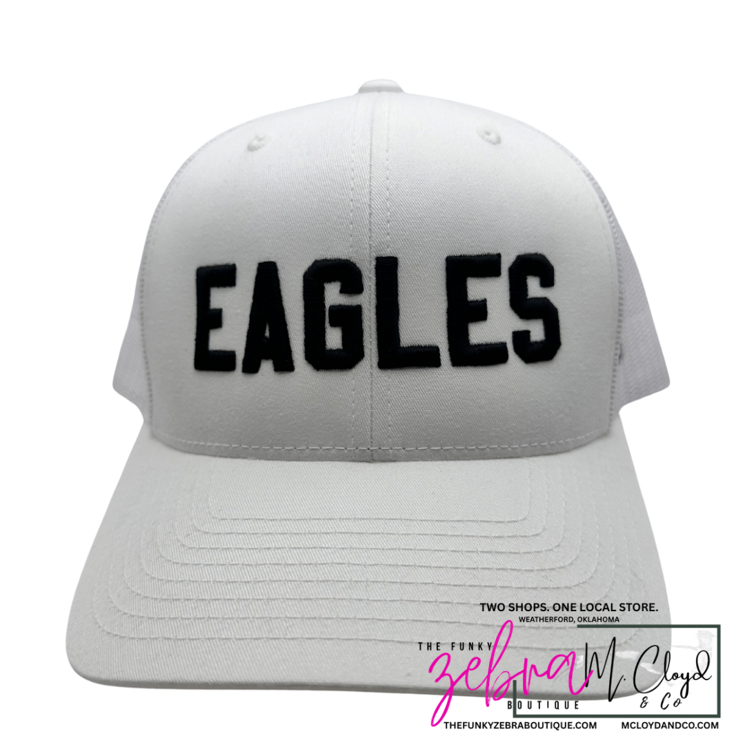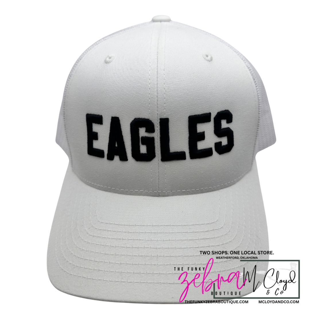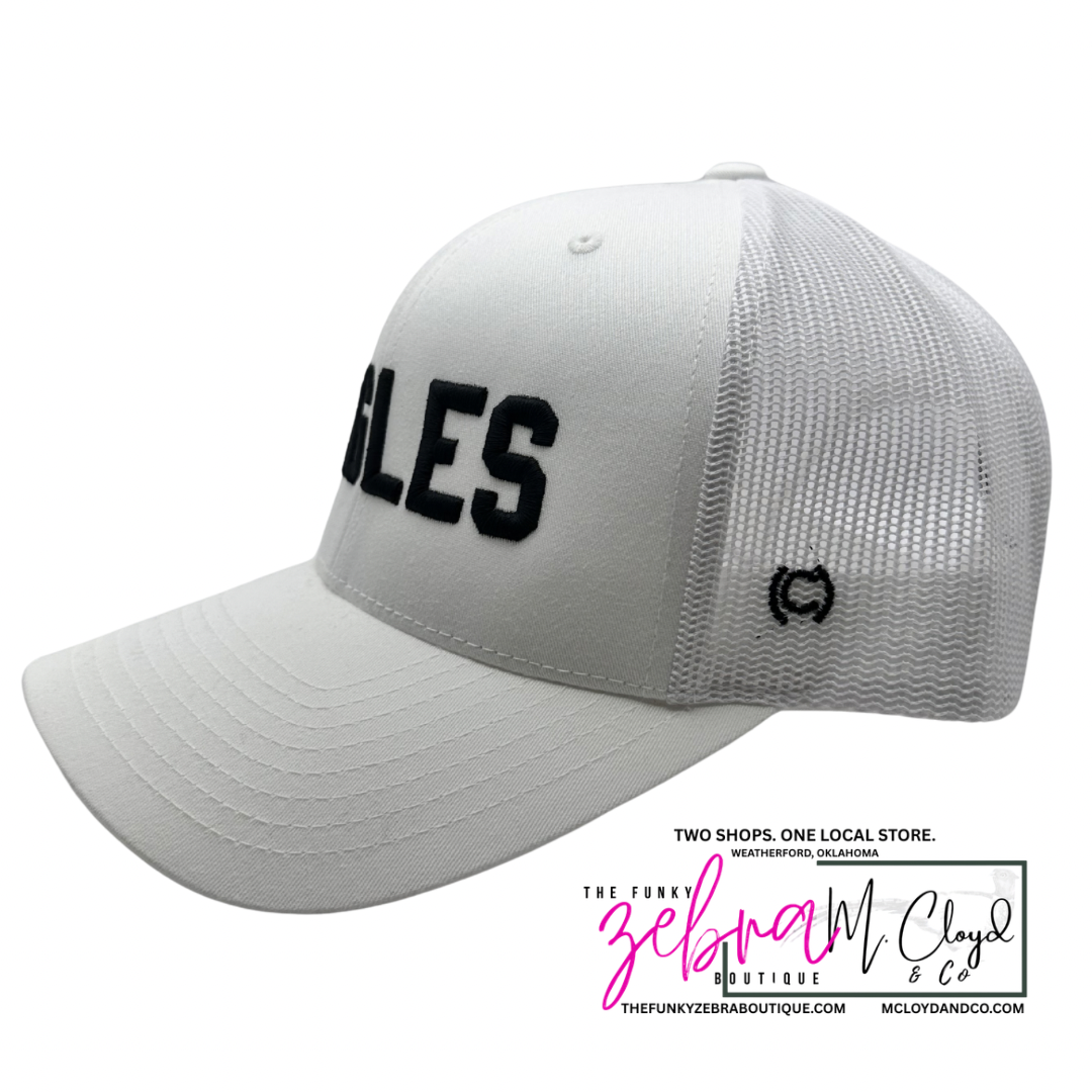 Custom Eagles raised 3D embroidery in black on a white mesh snapback hat.