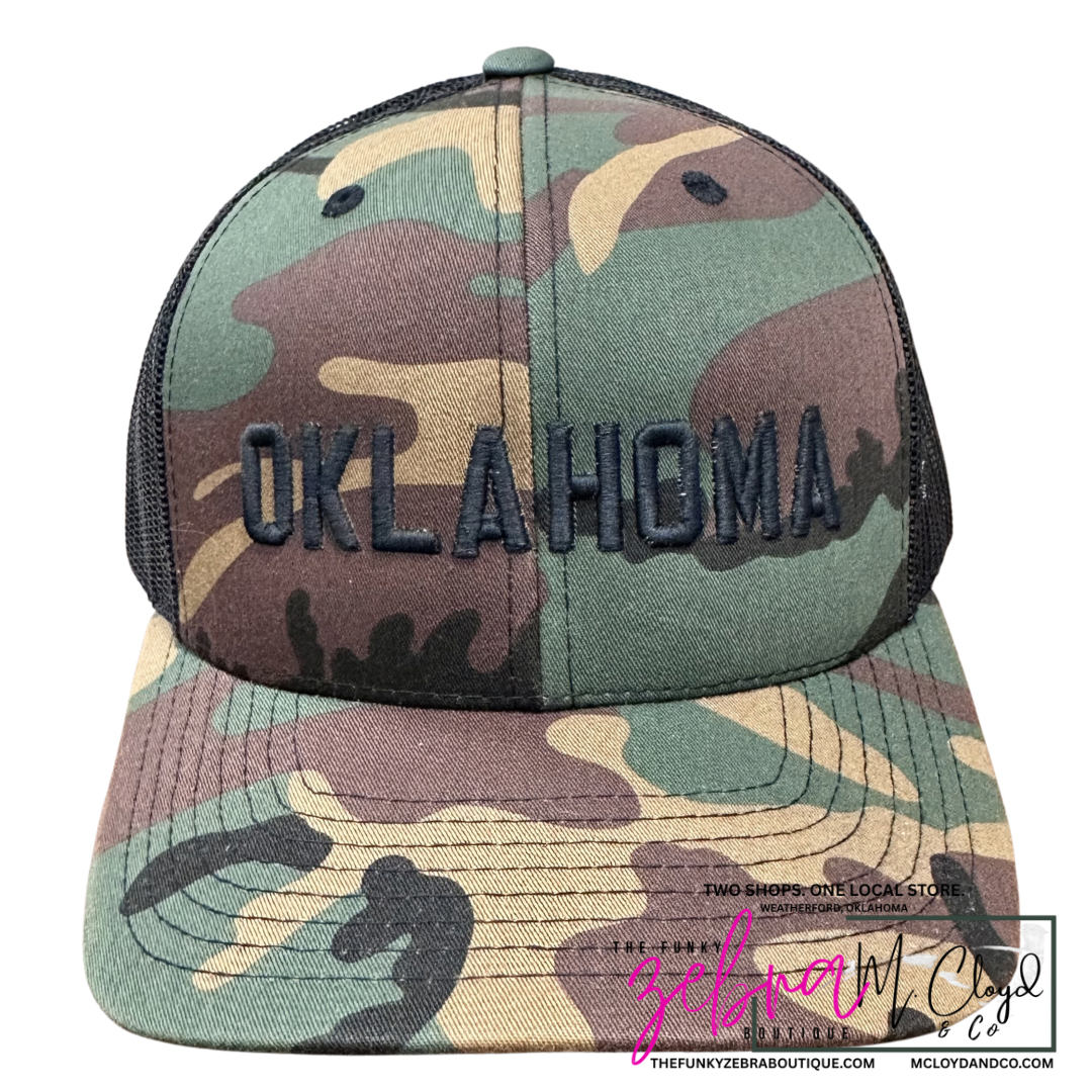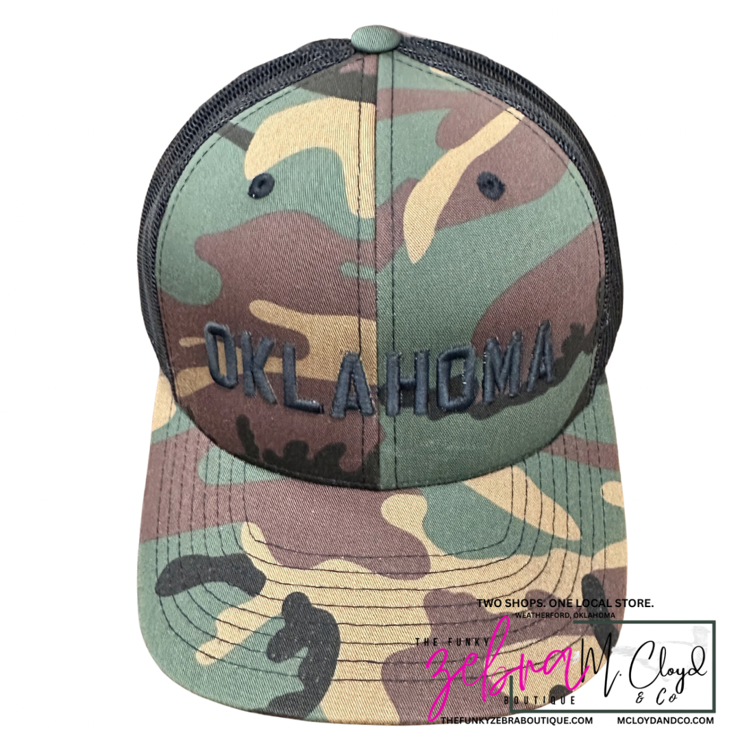 Custom Oklahoma raised 3D embroidery in white on a camouflage camo mesh snapback hat.