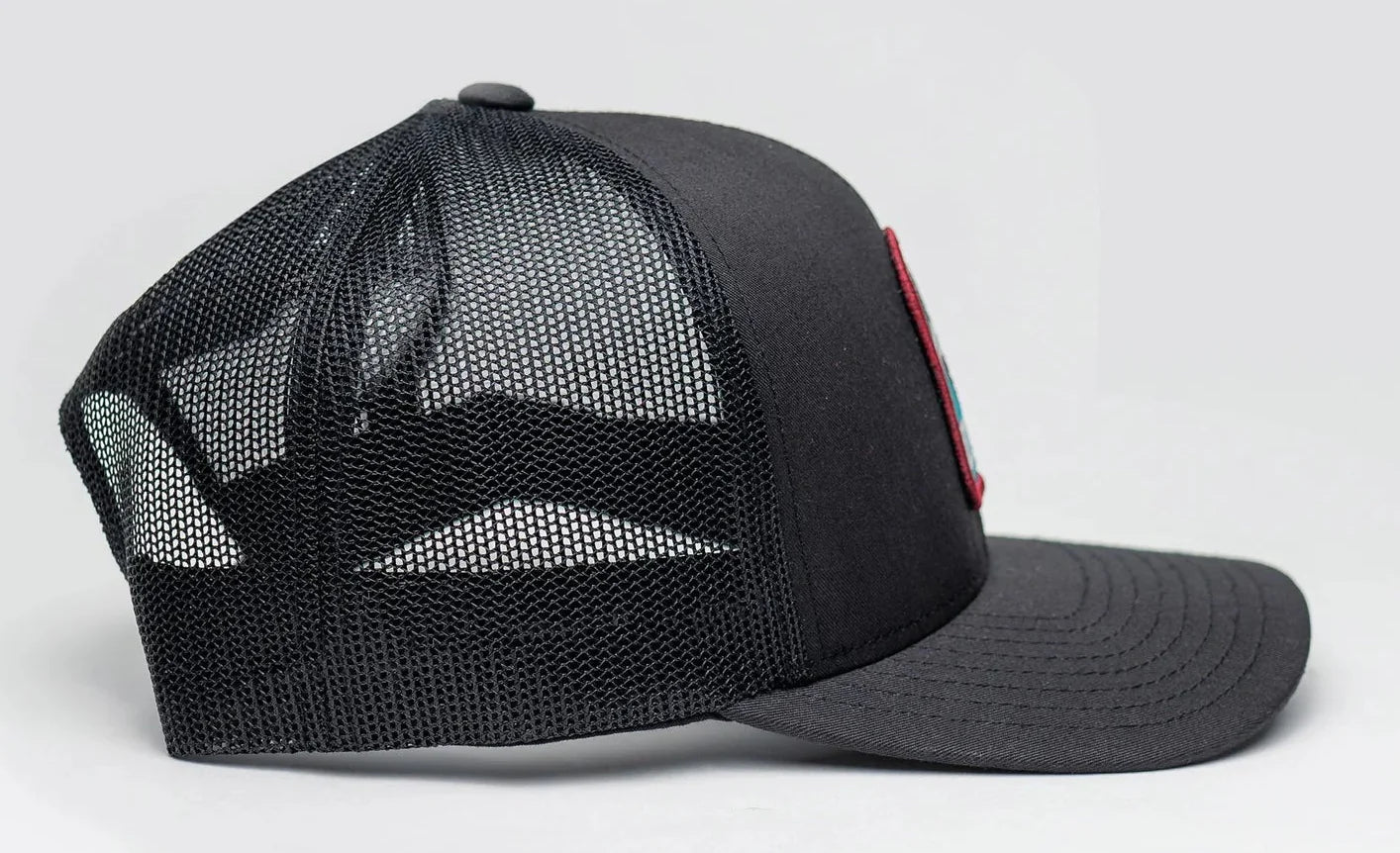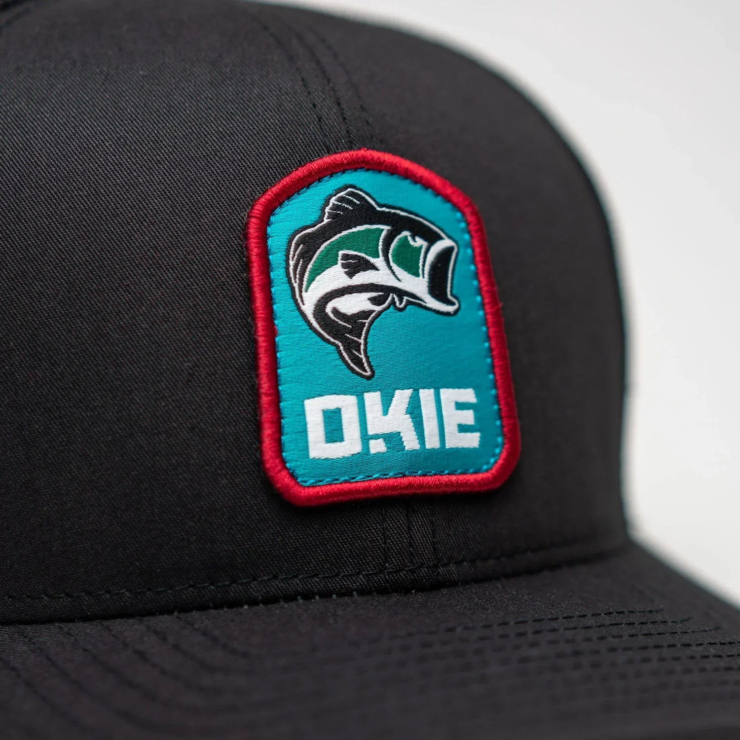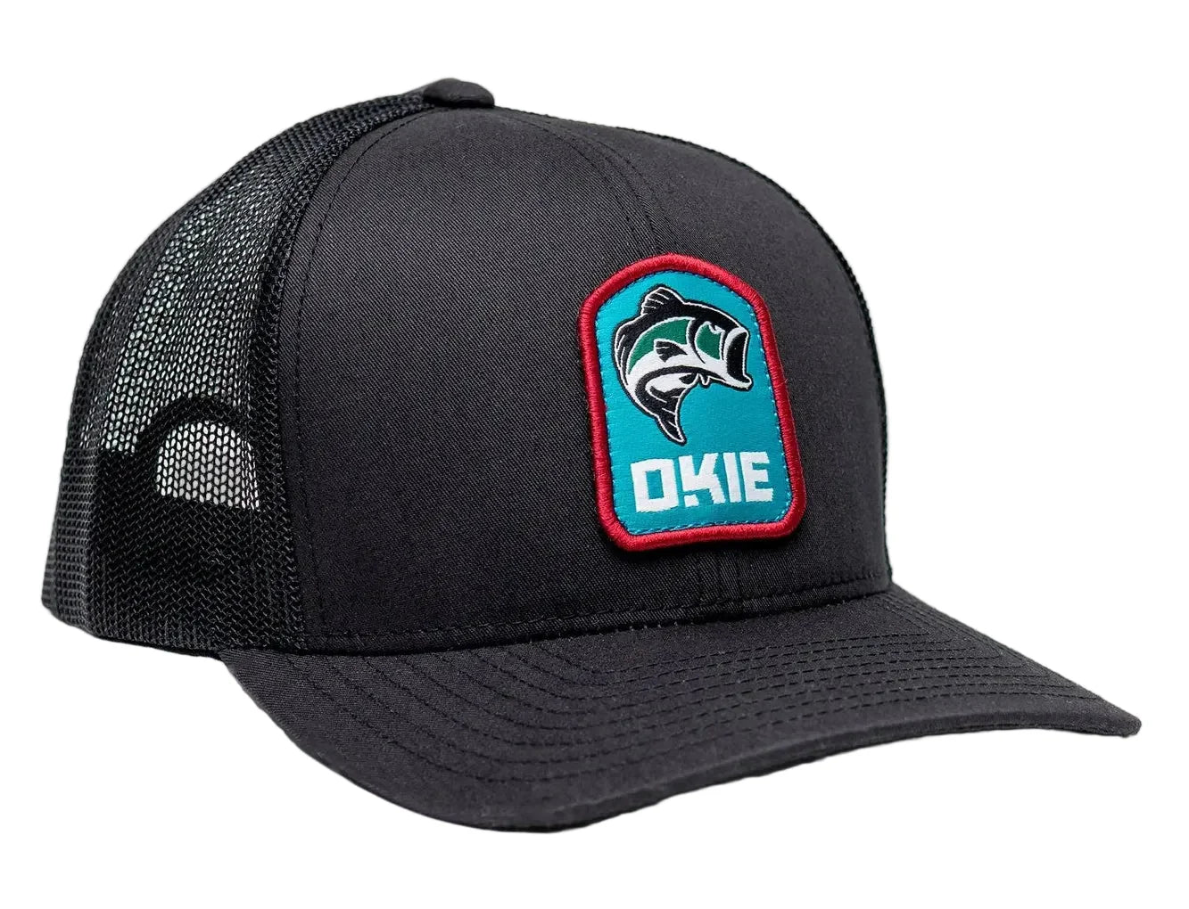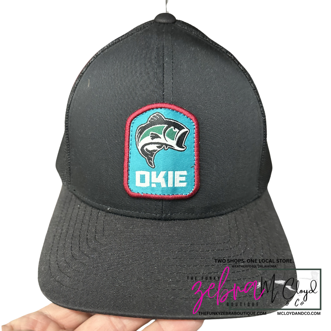 Okie Large Mouth Bass patch on a charcoal, mesh snapback hat.