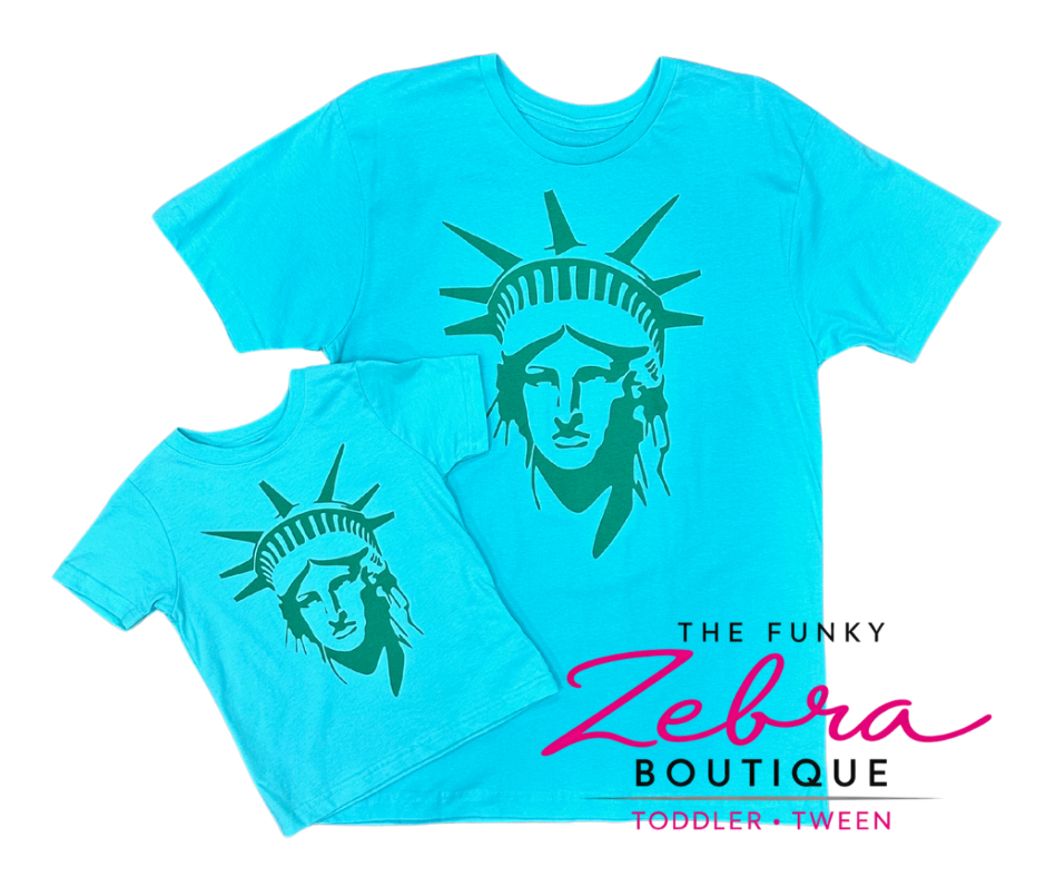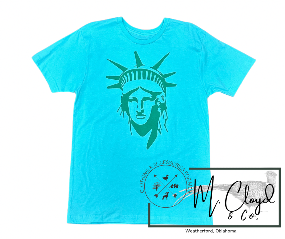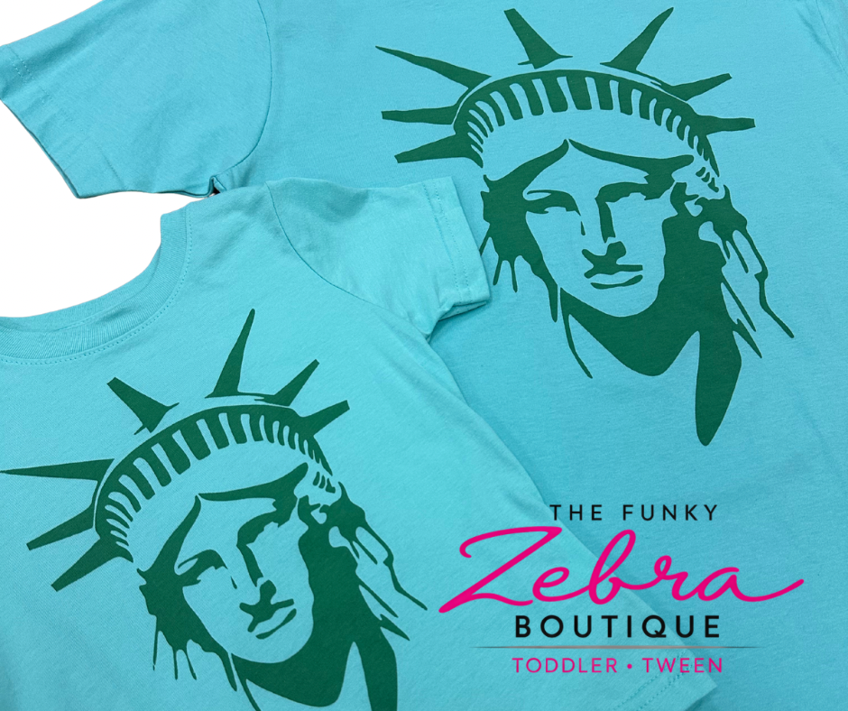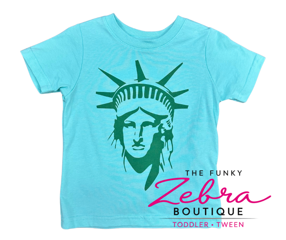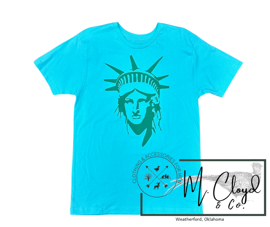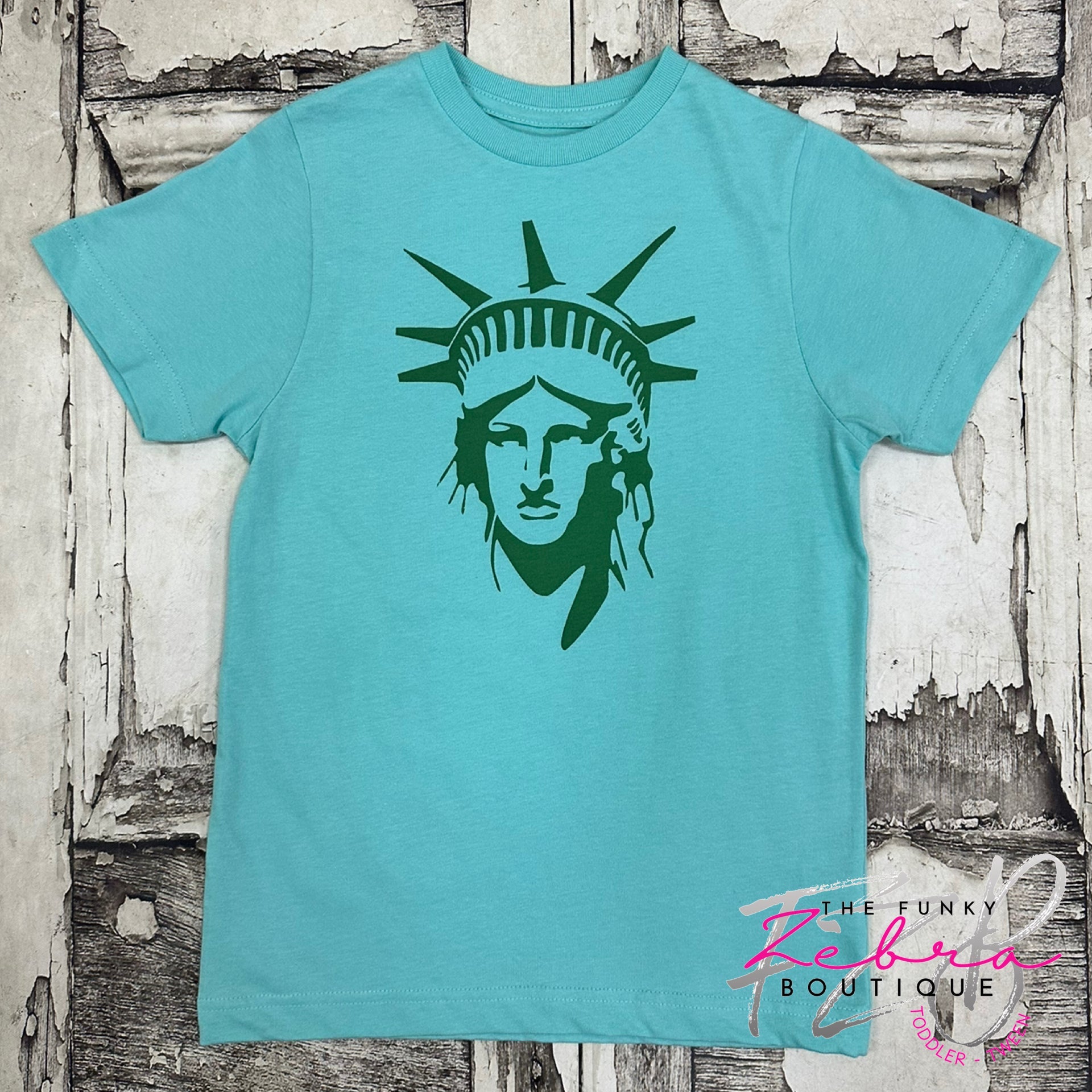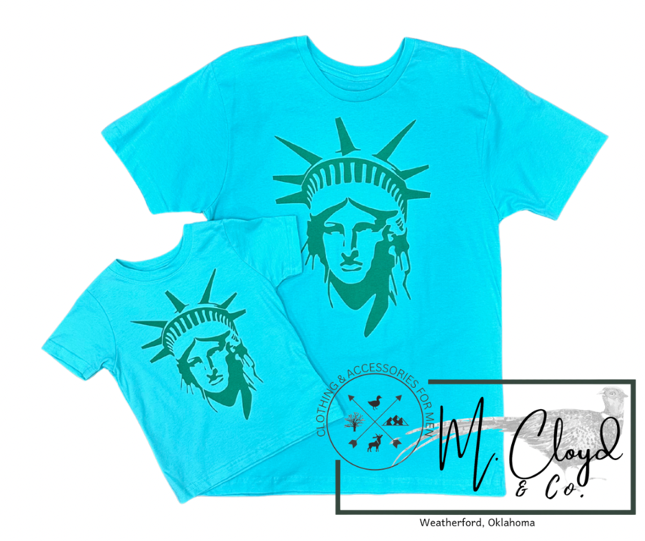 Nothing is a more iconic symbol of America than Lady Liberty! This tee shirt is perfect for any patriotic holiday. A short sleeve unisex tee in mint screen printed with vintage green water based ink for a soft vintage feel. We love to pair this tee with shorts while waving the American flag.