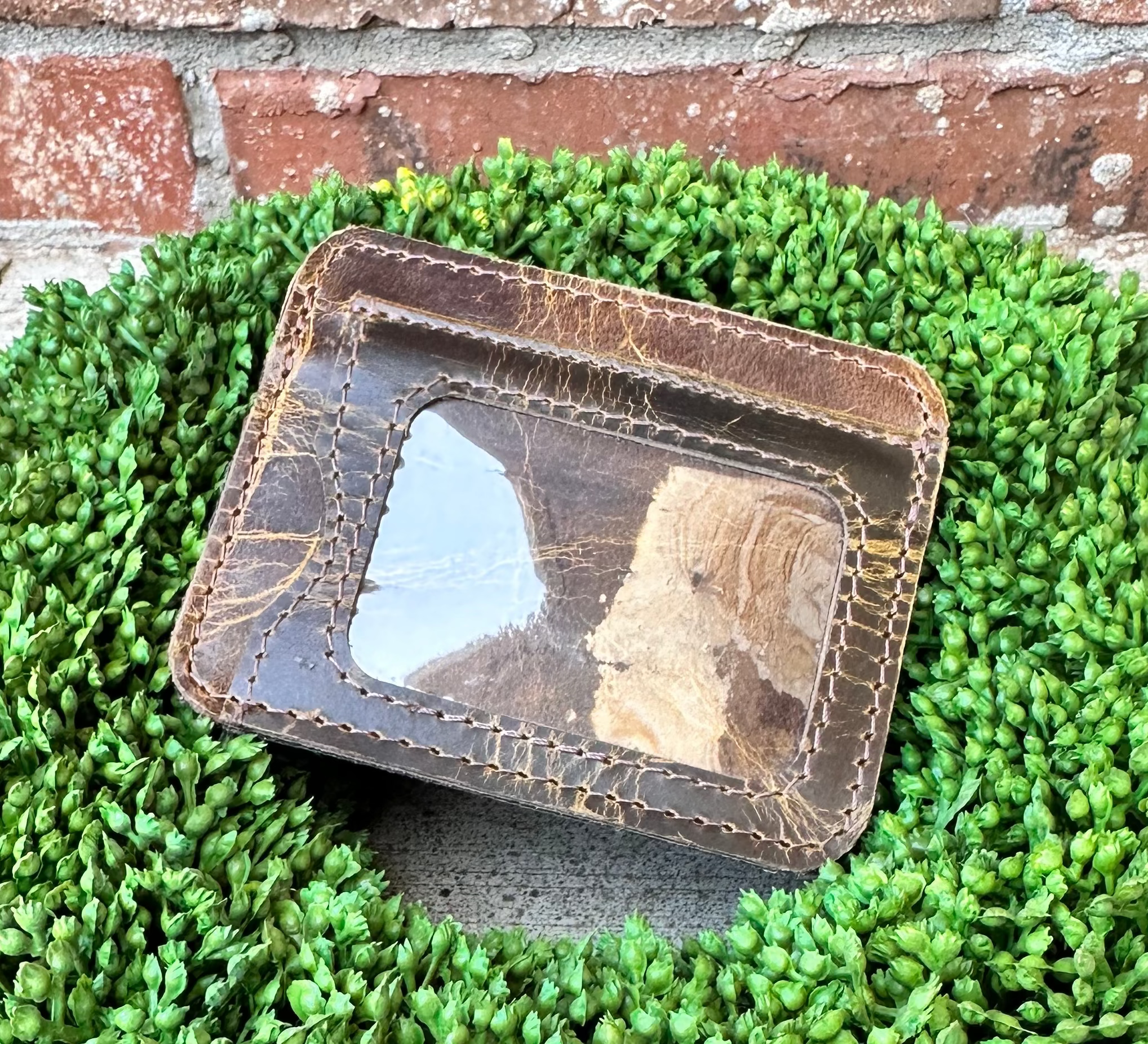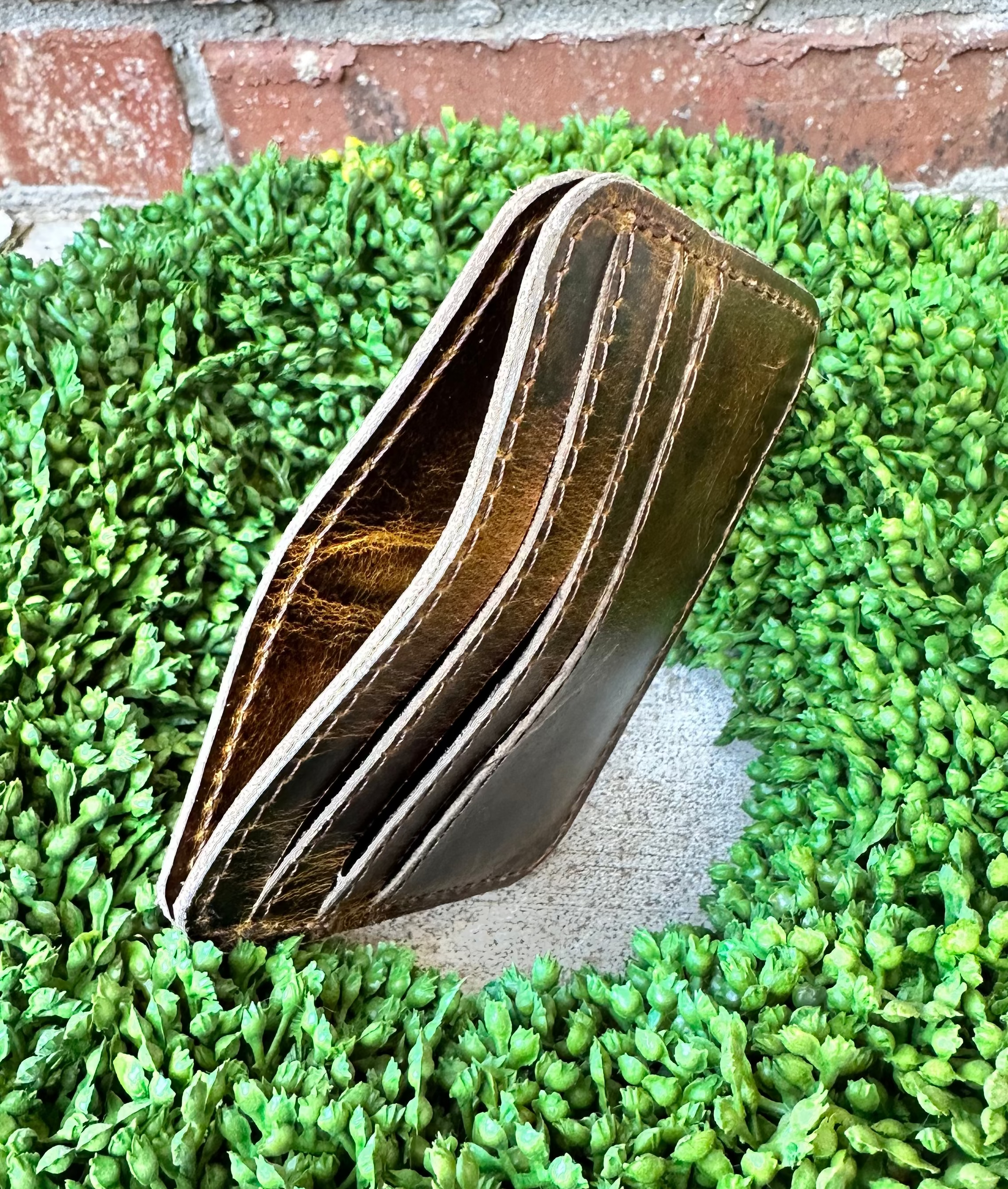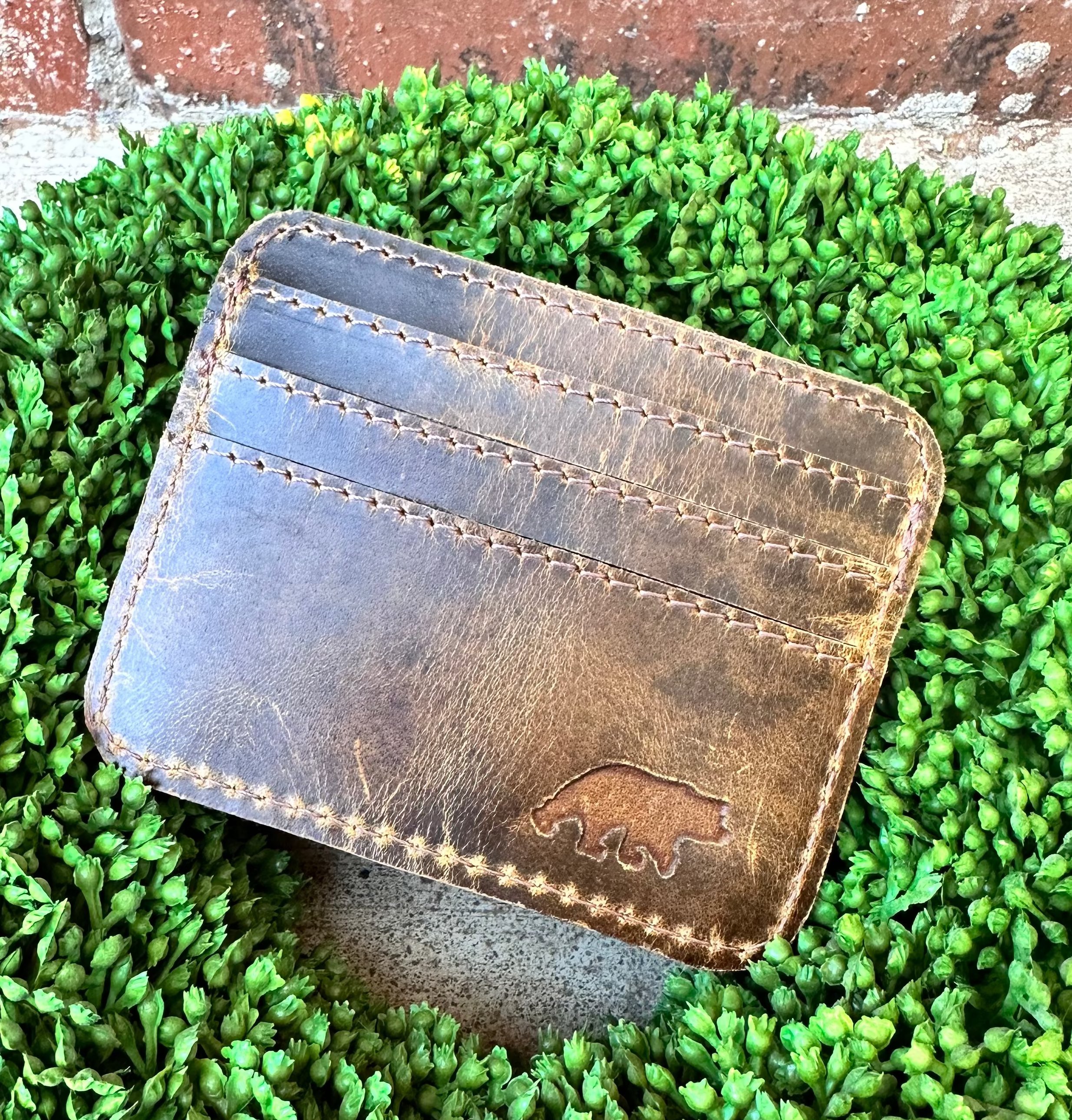 The perfect EDC wallet // Features 3 card slots on front, a cash pocket up top, and a clear ID sleeve on the back. 100% Top-Grain Water Buffalo Leather Middle slot opens to keep cash separate from cards Holds up to 3 credit cards on front Back of wallet holds drivers license / ID