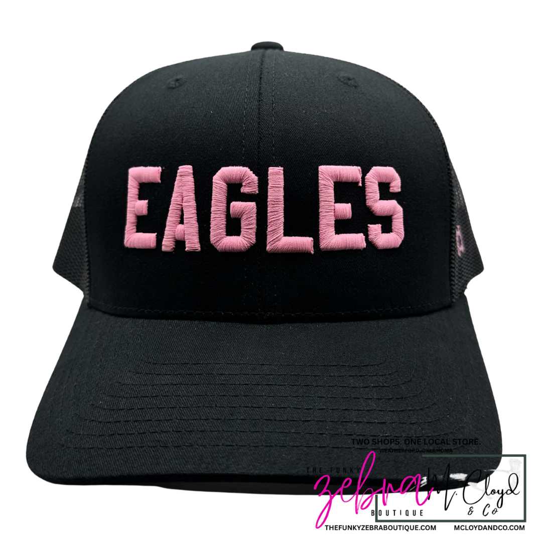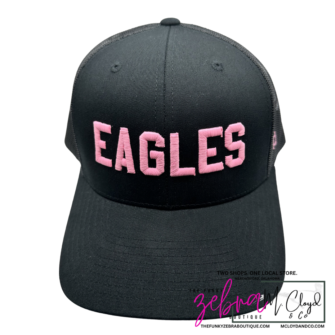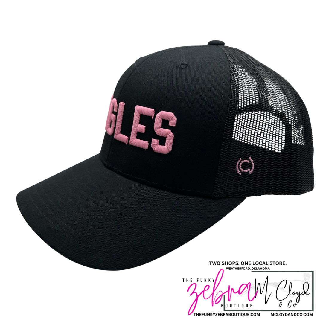 Custom Eagles raised 3D embroidery in candy pink on a black mesh snapback hat.