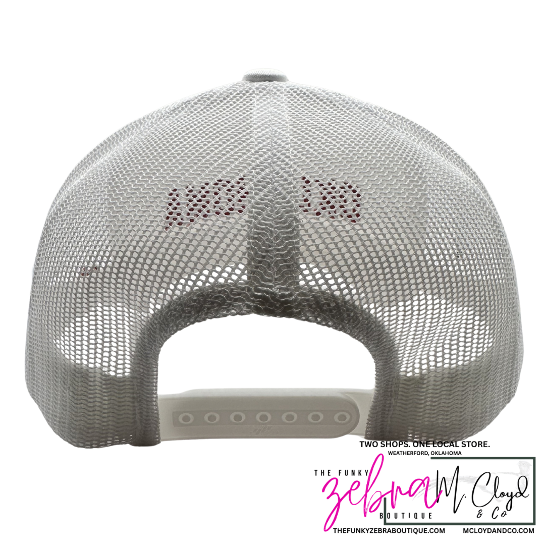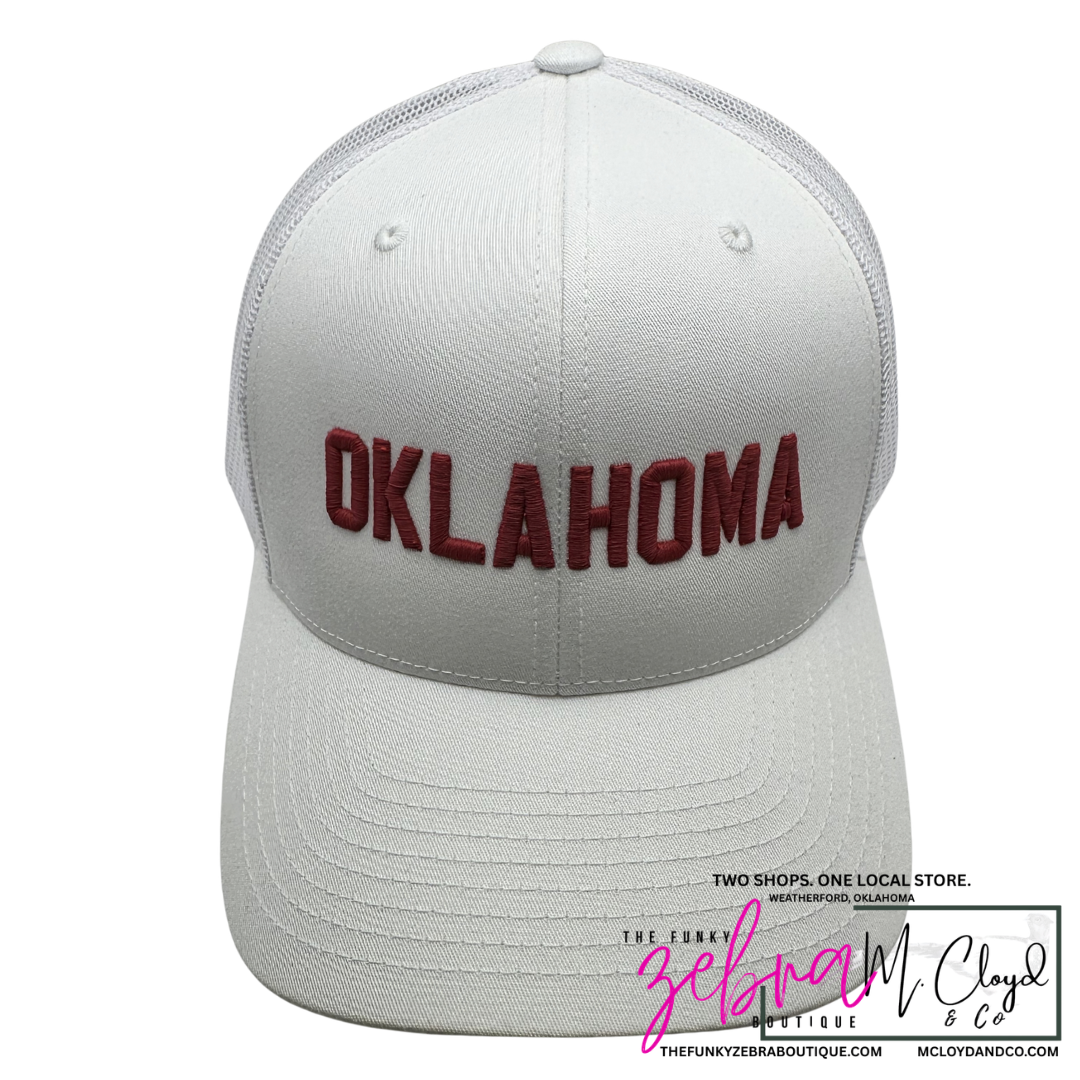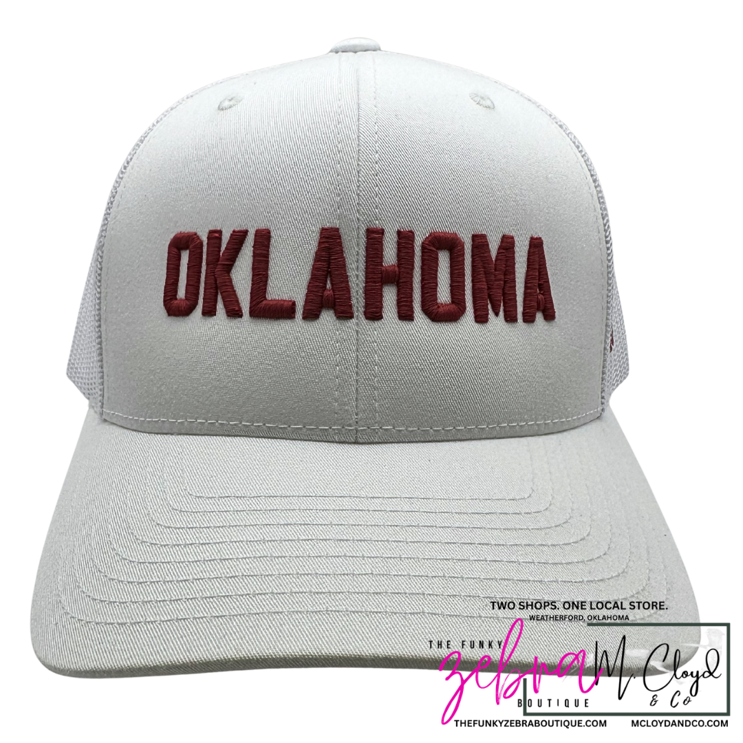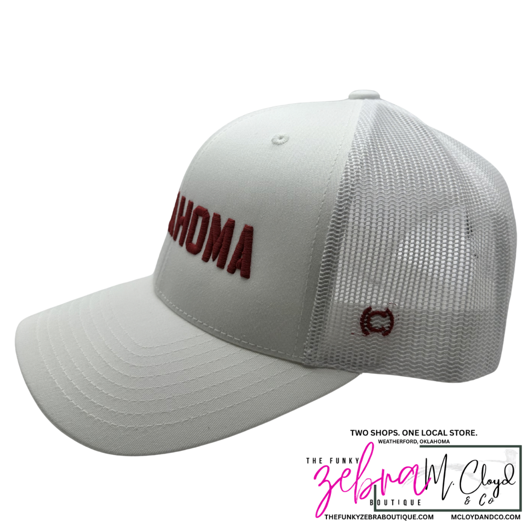 Custom Oklahoma raised 3D embroidery in crimson red on a white snapback hat.